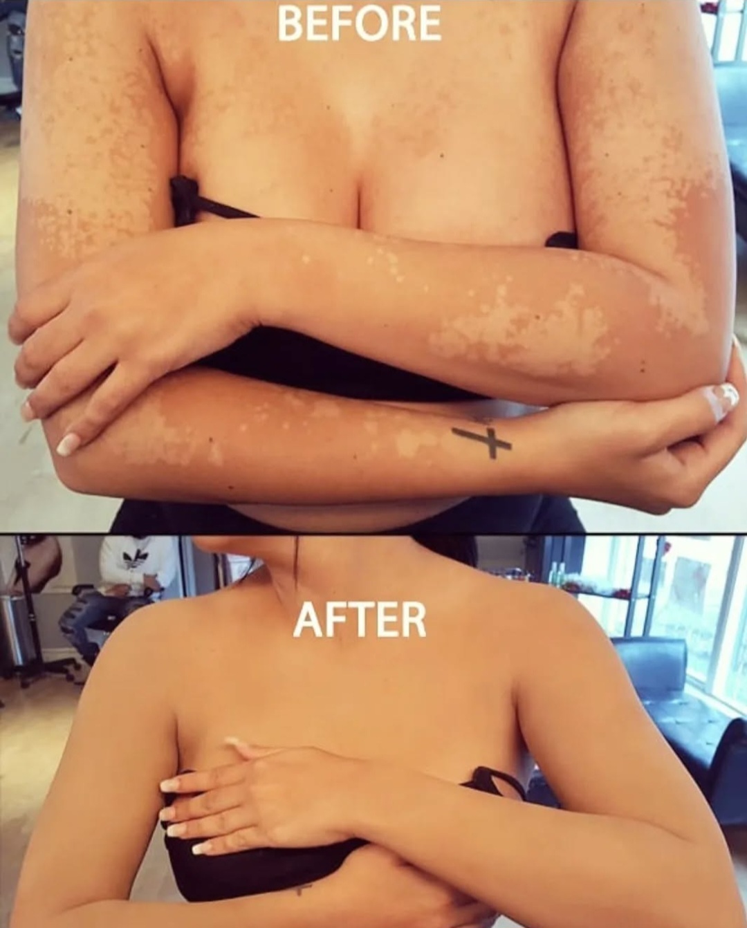 Airbrush makeup is non transferable, natural looking and completely waterproof, lasting for days. Ideal for seamless tattoo coverage, covering skin conditions like vitiligo, hyperpigmentation, hypopigmentation, cystic acne, scars, birthmarks, bruises, rosacea, melasma and others.